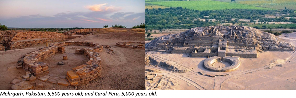 Göbekli Tepe – Turkey (9600 – 8200 BC), Mehrgarh – Pakistan (7000 – 5500 BC), Great Moraine Barnais – France (4800 – 3500 BC), Stonehenge with an age of 6,500 years and many other places in the world.